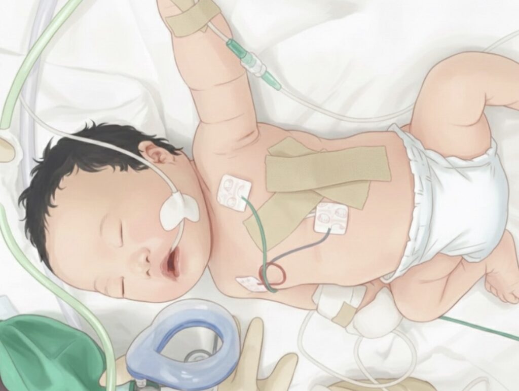 赤ちゃんを取り出してすぐに呼吸器をつけます。